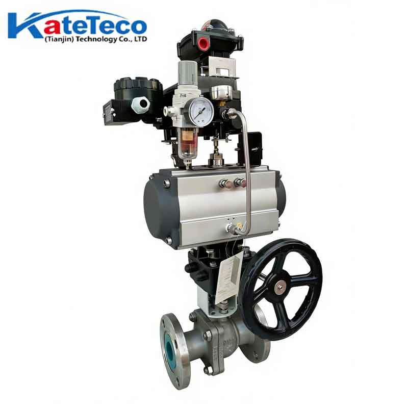 Pneumatisches Flanschkugelventil mit FRL-Einheit und Handrad, DN15-300 (½"-12"). Ein/Aus- oder Modulationssteuerung. Kohlenstoffstahl/Edelstahl. Ideal für Wasser, Öl und Gas. Inklusive Zubehör. Anpassbar.