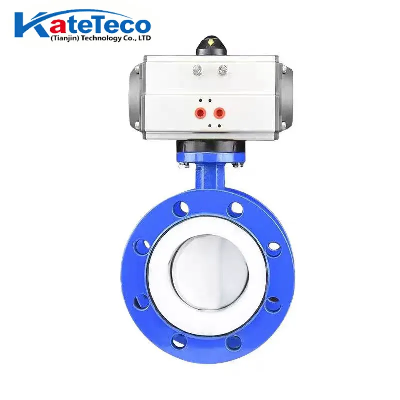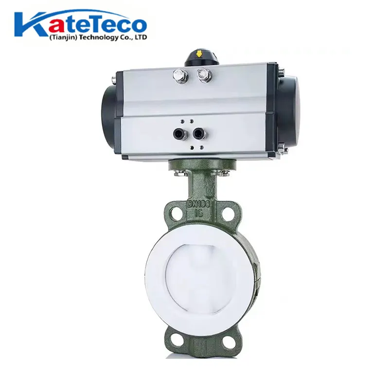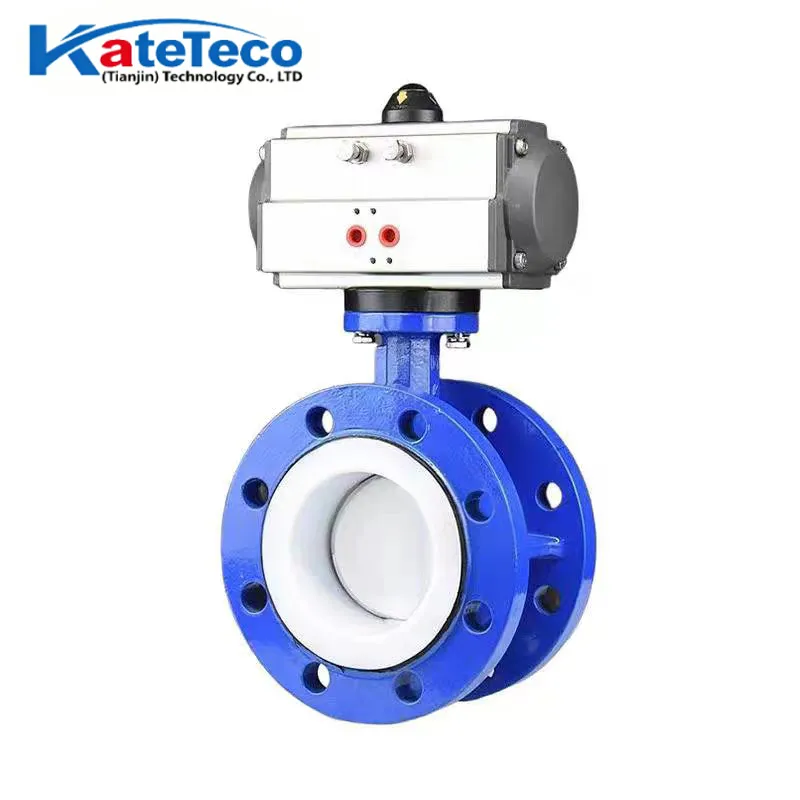 Pneumatische, PTFE-ausgekleidete Absperrklappe, DN40-600 (1½"-24"). Vollständige chemische Isolation für starke Säuren und korrosive Medien. Ein/Aus- oder stufenlose Regelung. Korrosionsfreie, antihaftbeschichtete Oberfläche. Ideal für die chemische und pharmazeutische Industrie. Kundenspezifisch anpassbar.