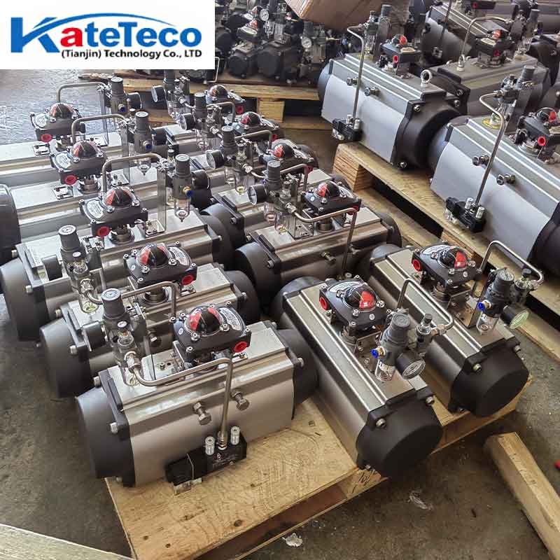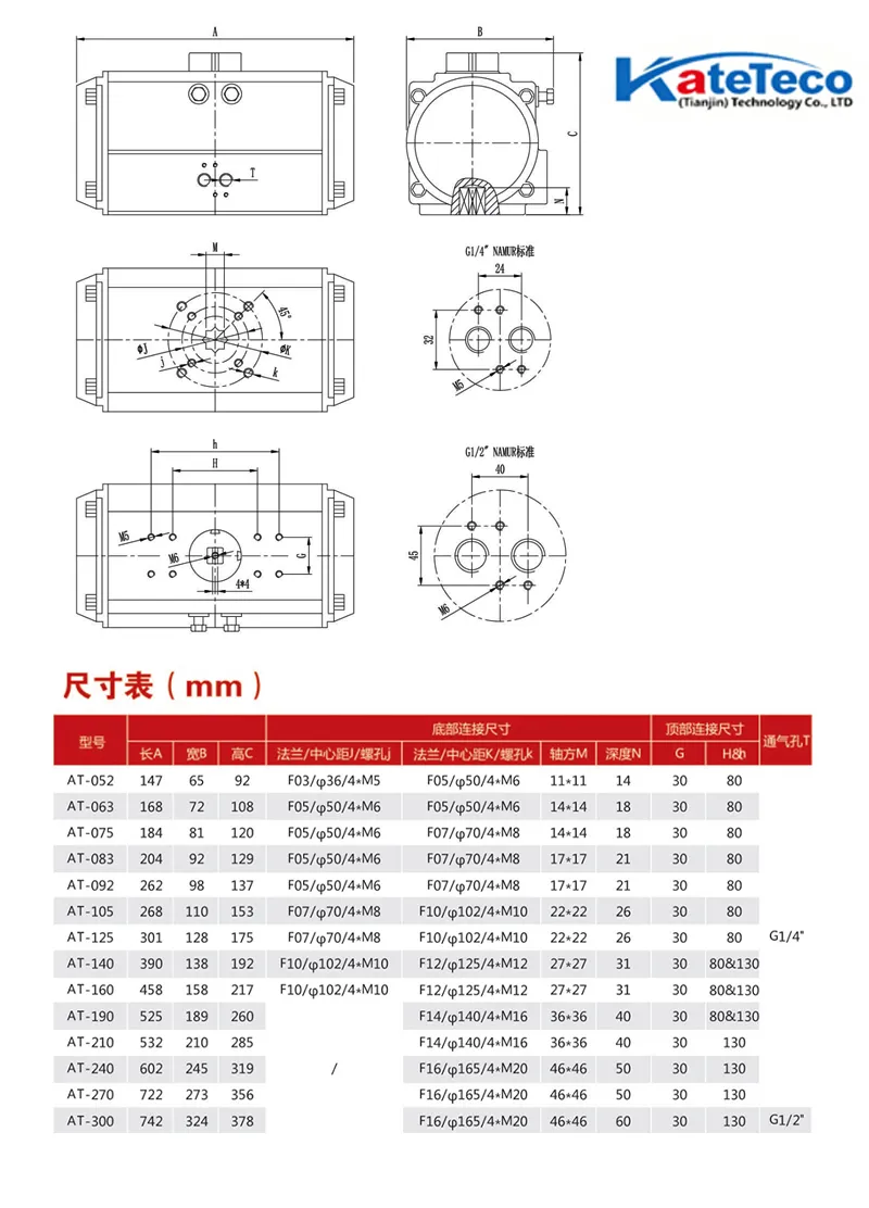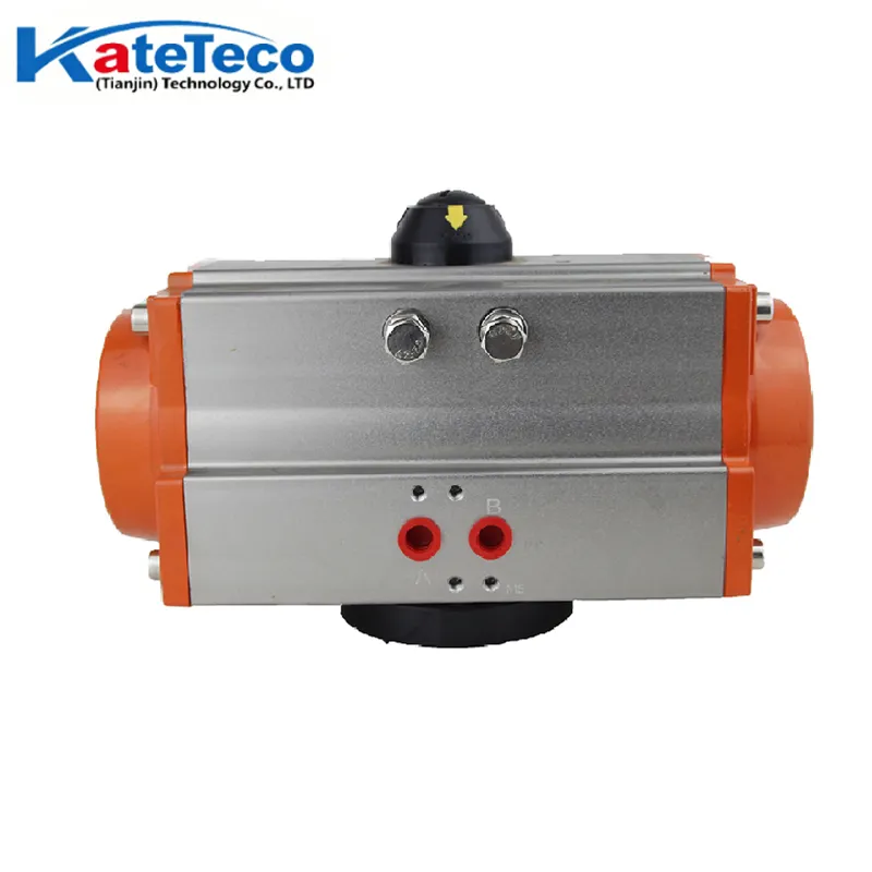 The AT – type pneumatic actuator, powered by compressed air, features a compact double – piston gear – rack structure. It has two working types: double – acting and single – acting. Installation requires ensuring coaxiality and clean air. Its standard stroke is 0° – 90°, with a common air pressure of 2.5 – 8 bar, and operating temps vary by seal material.